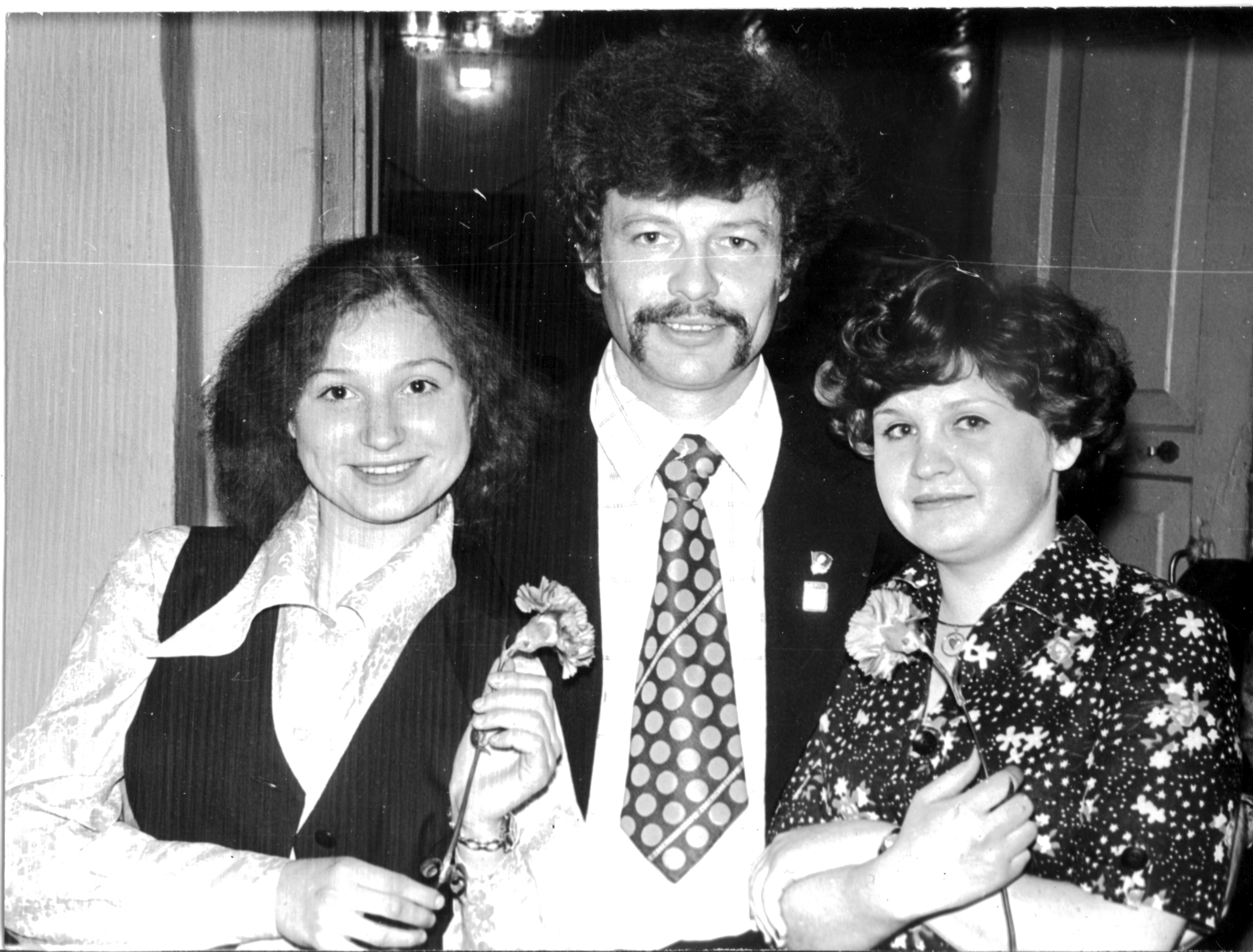 1979- Студентки Ольга Кох и Елизавета Дегтярева с секретарем комсомольской организации техникума перед началом вечера-встречи с выпускниками прошлых лет спортсменами.